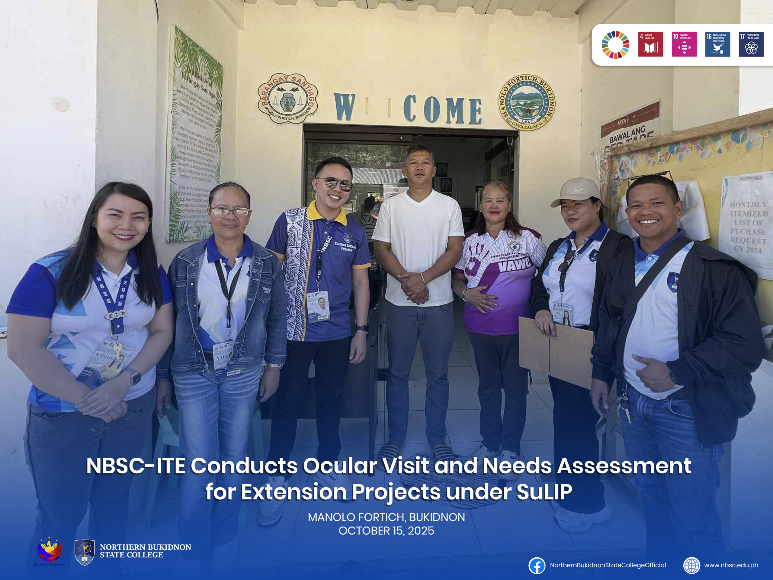 Read MoreNBSC-ITE CONDUCTS OCULAR VISIT AND NEEDS ASSESSMENT FOR EXTENSION PROJECTS UNDER SULIP The Institute for Teacher Education (ITE) of Northern Bukidnon State College (NBSC) conducted an ocular visit and needs…