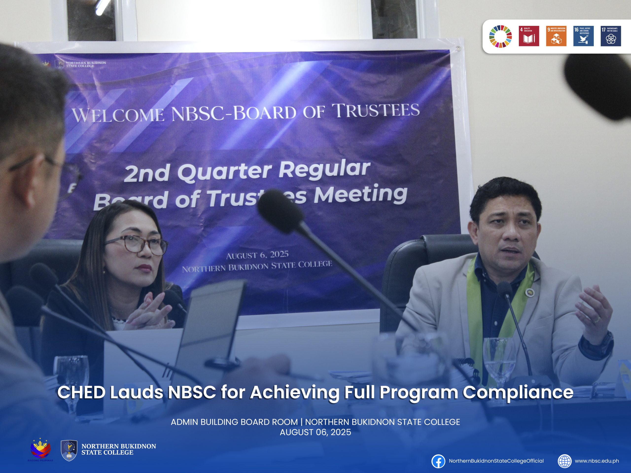The Commission on Higher Education (CHED) commended Northern Bukidnon State College (NBSC) for attaining 100% program compliance under the Outcome-Based and Compliance-Driven Regulatory Assessment – Strategic Performance Indicators System (OCDRA-SPIsys), as announced during the NBSC Board of Trustees (BOT) second quarter regular meeting on Wednesday, August 6, 2025.