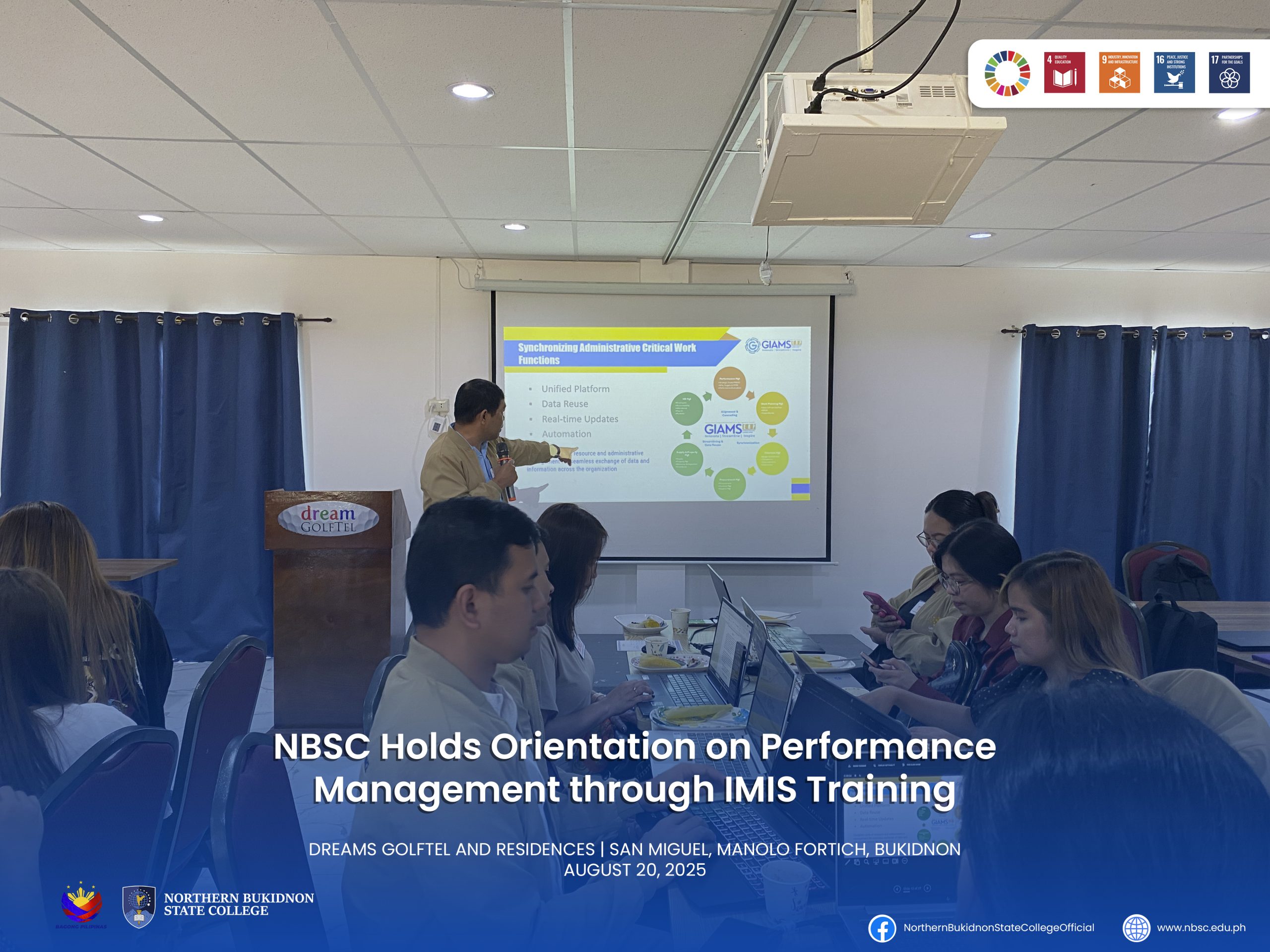 Northern Bukidnon State College (NBSC), in partnership with the University of Science and Technology of Southern Philippines (USTP), conducted an orientation on Performance Management as part of the Integrated Management Information System (IMIS) Training Series on August 20, 2025, at the Dreams Golftel and Residences, San Miguel, Manolo Fortich, Bukidnon.