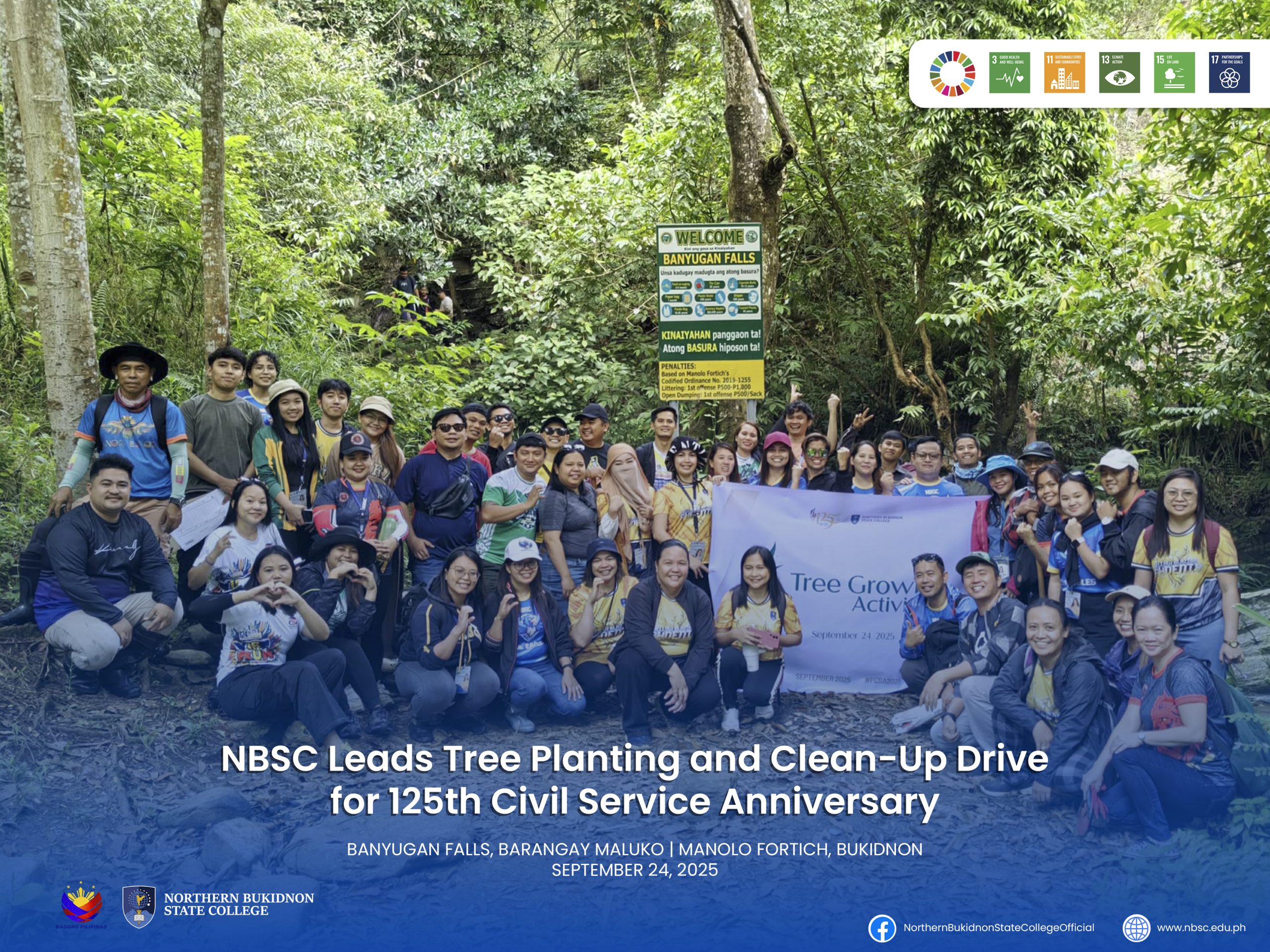 Northern Bukidnon State College (NBSC), through its Human Resource Management Development Office (HRMDO), in collaboration with the Community Extension Services Division (CESD) and the General Services Office (GSO), spearheaded a tree planting and clean-up drive on September 24, 2025, in celebration of the 125th Civil Service Anniversary.