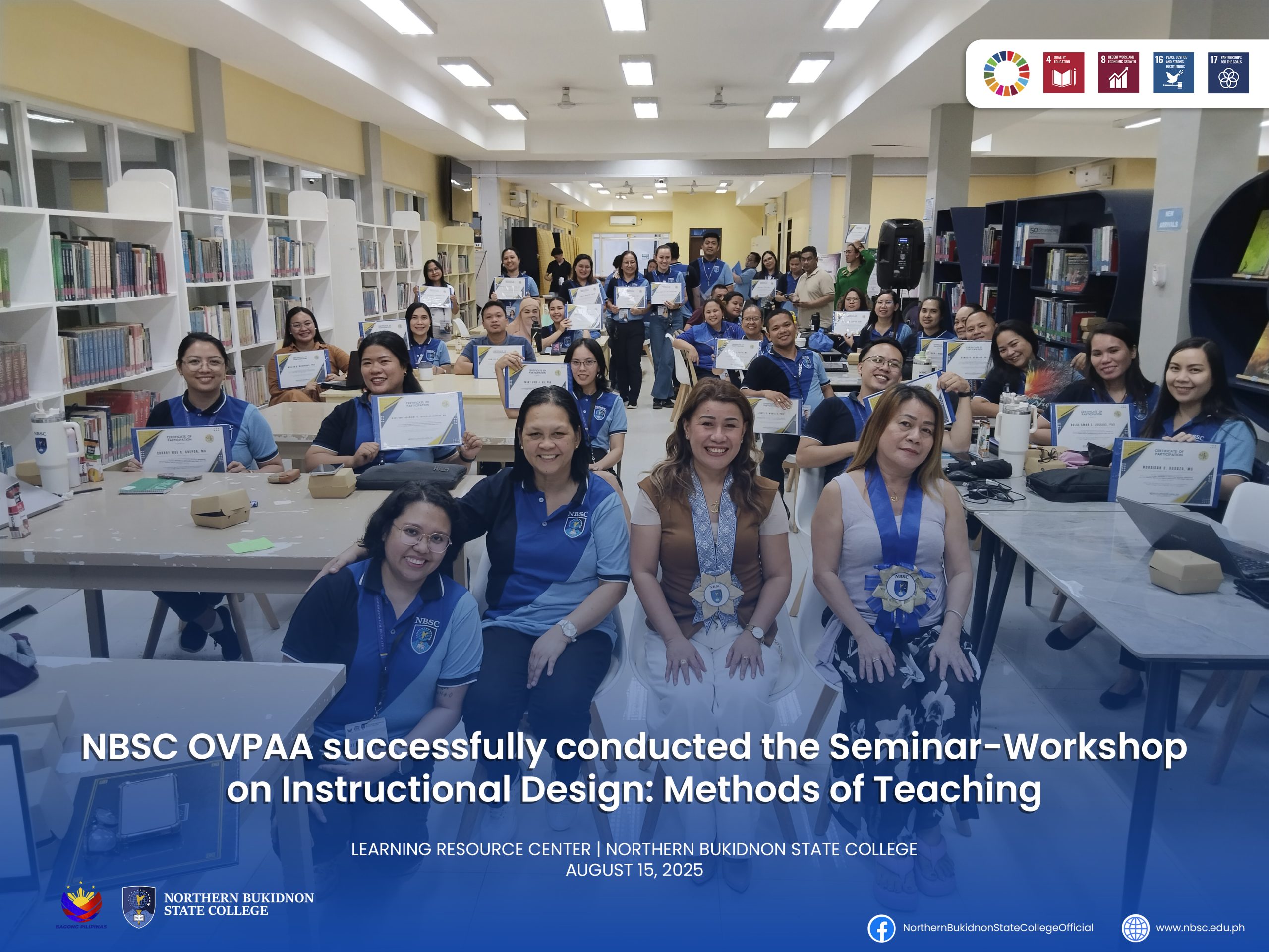 The Office of the Vice-President for Academic Affairs (OVPAA) of Northern Bukidnon State College held a seminar-workshop on Instructional Design: Methods of Teaching on August 15, 2025, at the NBSC Learning Resource Center (LRC), with the theme “How to Facilitate Instruction with Rigor and Ease”.