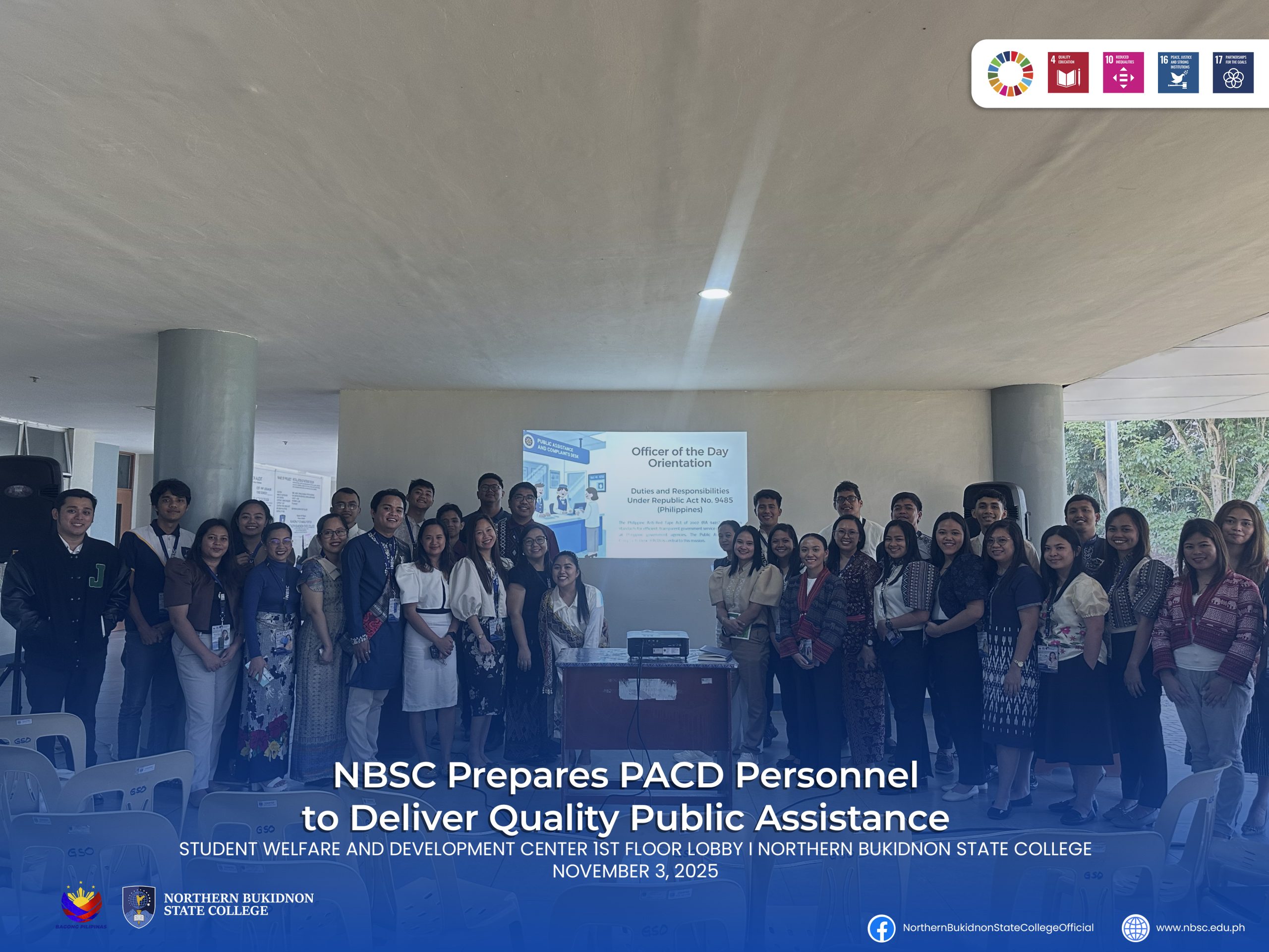 Northern Bukidnon State College (NBSC) hosted an orientation session on November 3, 2025, at the Student Welfare and Development Center (SWDC), 1st Floor Lobby for officers assigned to serve at the Public Assistance and Complaints Desk (PACD) during November and December 2025. Grounded on R.A. 11032, or the Ease of Doing Business and Efficient Government Service Delivery Act of 2018, the event aimed to equip these officers with the knowledge and skills necessary for their roles, ensuring they were well-prepared to effectively carry out their duties as Public Assistance Officers.