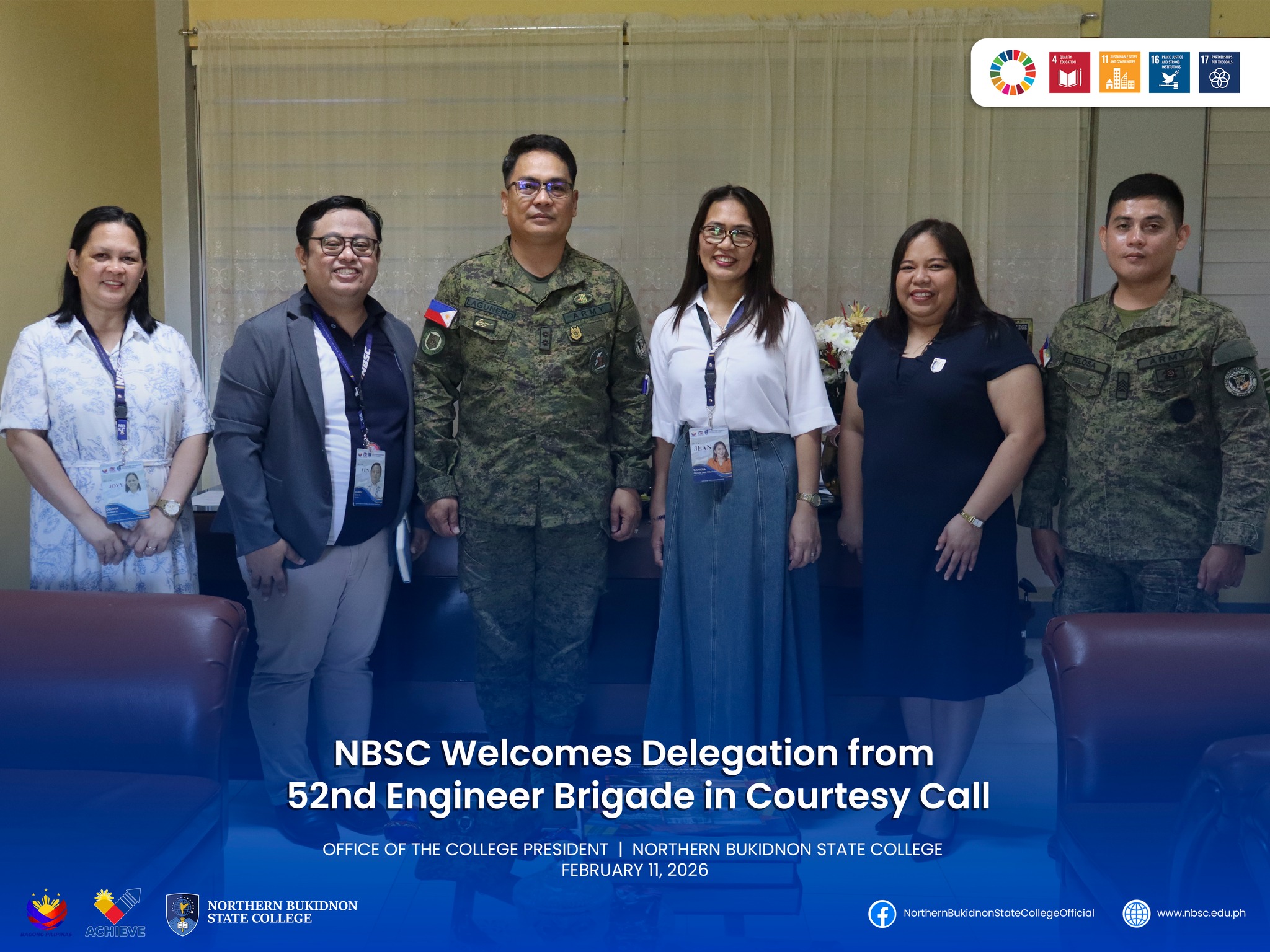 Northern Bukidnon State College (NBSC) welcomed a delegation from the 52nd Engineer Brigade of the Philippine Army during an official courtesy call on February 11, 2026, at the Office of the College President. The visit provided an opportunity for both parties to engage in discussions on matters of mutual interest.