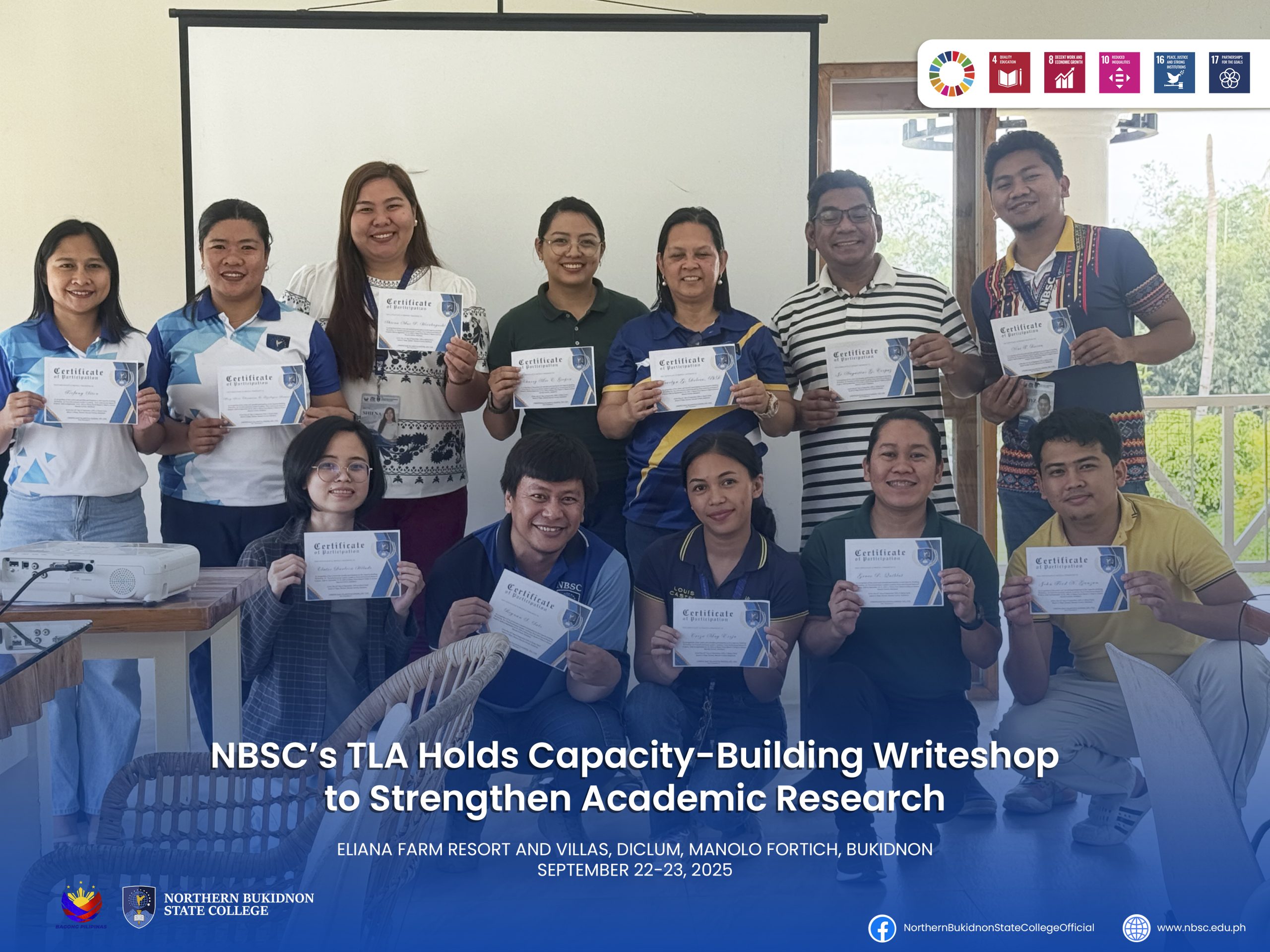 The Transformational Leaders Academy (TLA) of Northern Bukidnon State College (NBSC) successfully conducted its Capacity Building Writeshop on September 22-23, 2025 at Eliana Farm Resort and Villas, Diclum, Manolo Fortich, Bukidnon. The event gathered TLA proponents from various NBSC institutes for two days of intensive learning and collaboration.