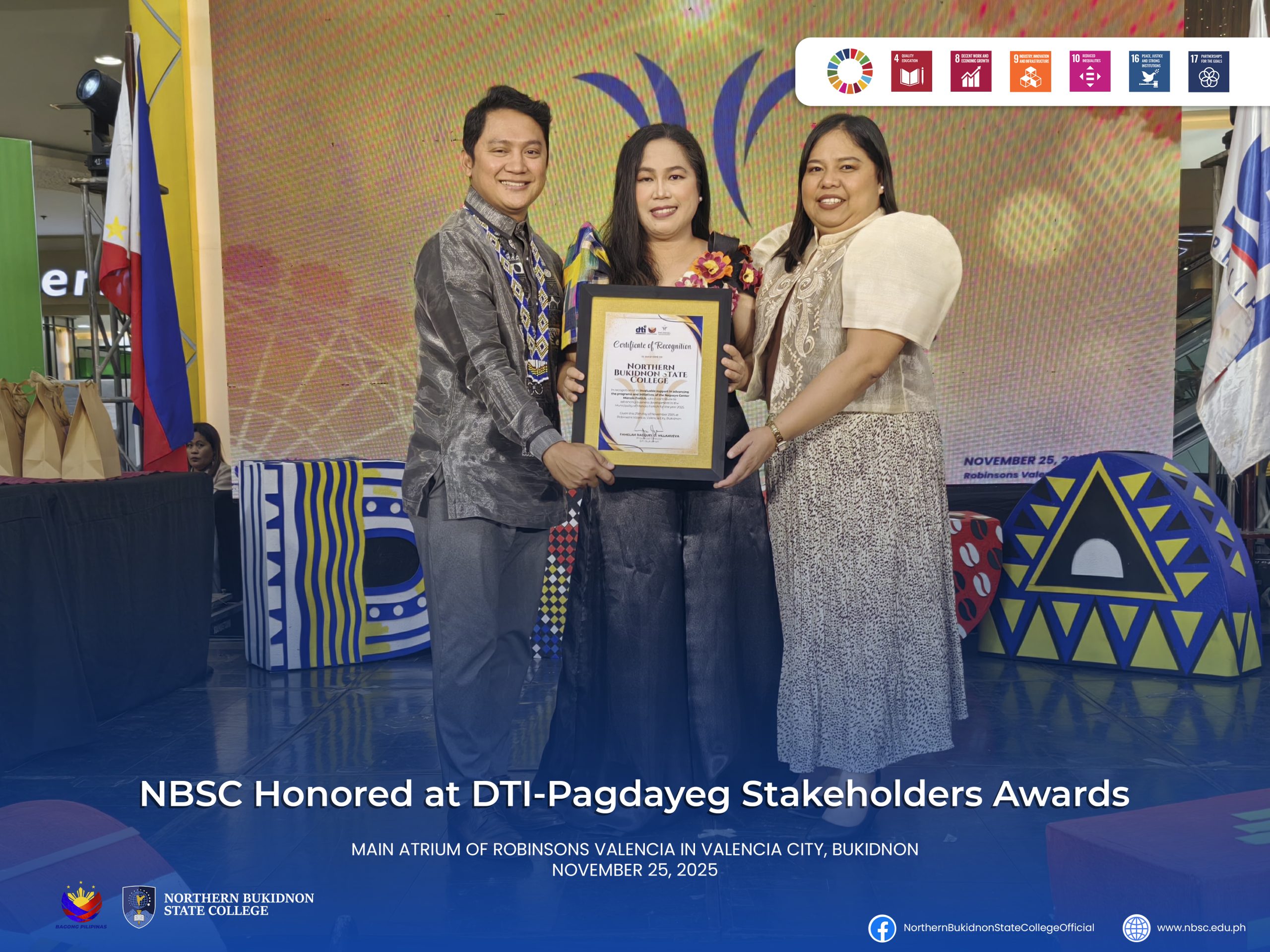 Read MoreNBSC HONORED AT DTI-PAGDAYEG STAKEHOLDERS AWARDS Northern Bukidnon State College (NBSC) representatives joined the DTI-Pagdayeg Stakeholders Awards on the afternoon of November 25, 2025, at the Main Atrium of Robinsons…